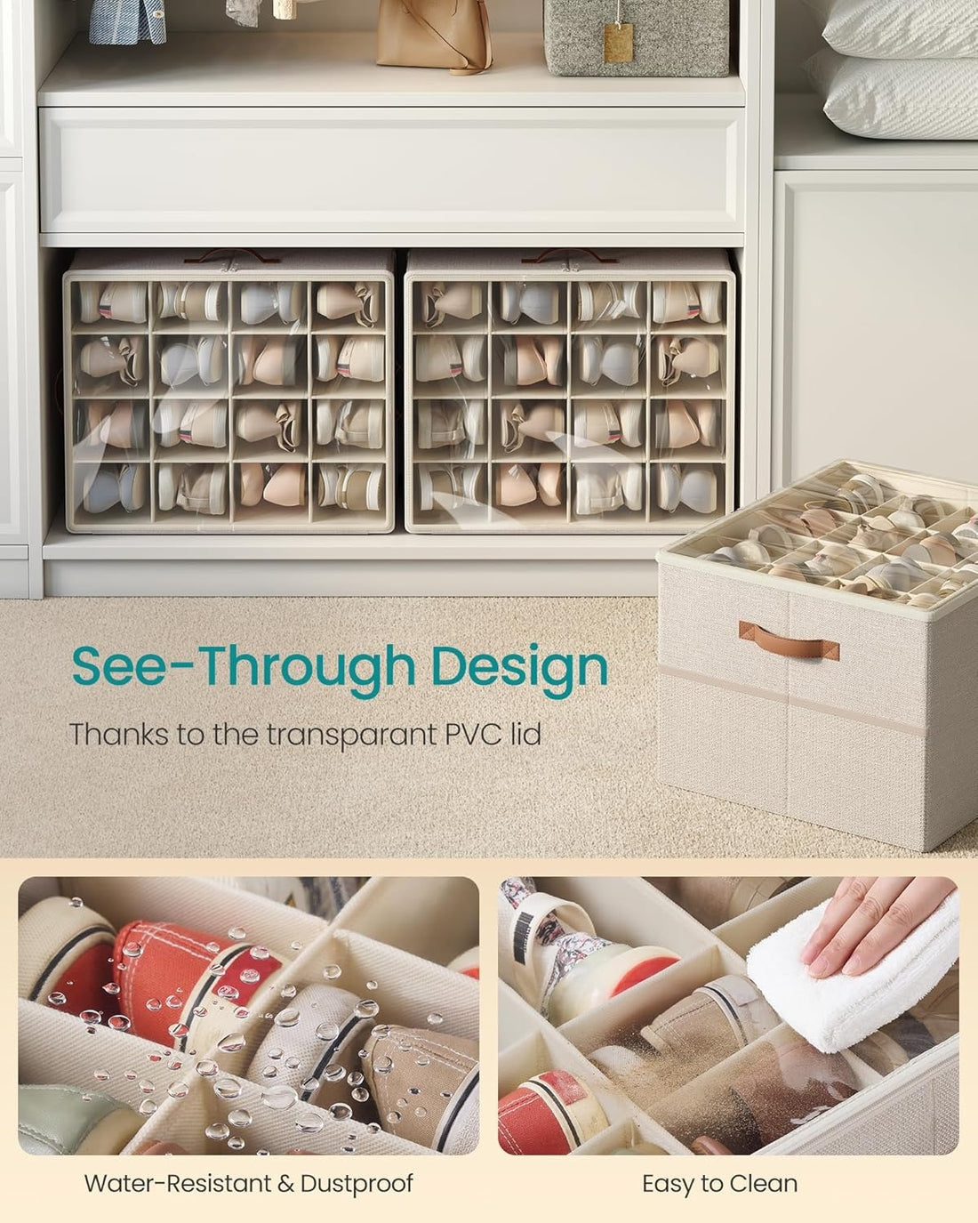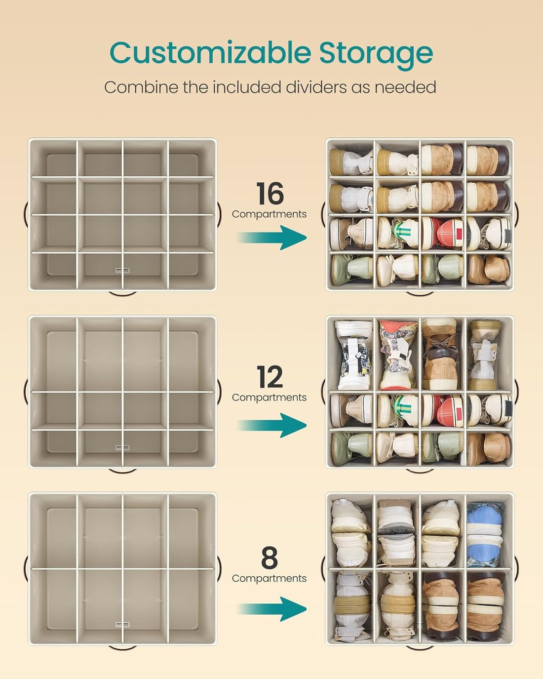 Format généreux 43 × 32 × 32 cm avec 12 compartiments : baskets, sandales, bottines… tout trouve sa place.